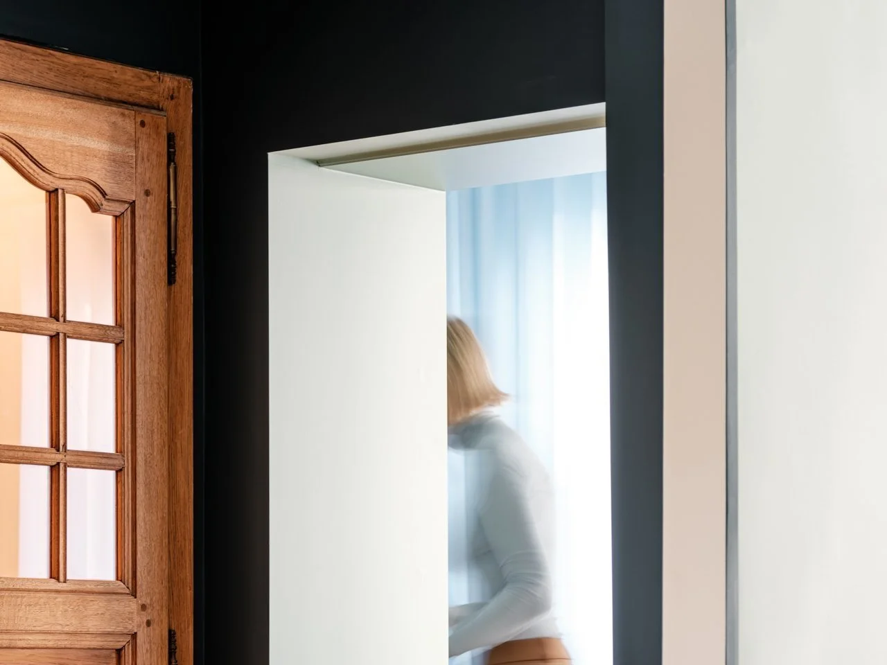We preserved the house's inherent features such as wooden doors, floors, and ceiling moldings, while introducing vibrant color schemes and contemporary designs like Muller Van Severen. The rear extension underwent a complete overhaul, featuring a practical, elongated cabinet seamlessly integrated with mirrored doors, moldings, and bold hues.